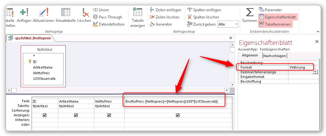Die Geänderte Formel sieht dann so aus: [Nettopreis] + [Nettopreis] / 100 * [UstSteuersatz]. Diese angepasste Formel tragen wir dann in der Entwurfsansicht der Abfrage ein. Da ich für die Spalte UstSteuersatz den Datentyp Zahl/Dezimal verwendet habe, ist für Access jetzt nicht mehr automatisch klar, dass das Ergebnis unserer Berechnung als Währung formatiert werden soll. Um, dies zu erreichen Stelle ich in dem Eigenschaftsblatt für die berechnete Spalte explizit dieses Format ein.