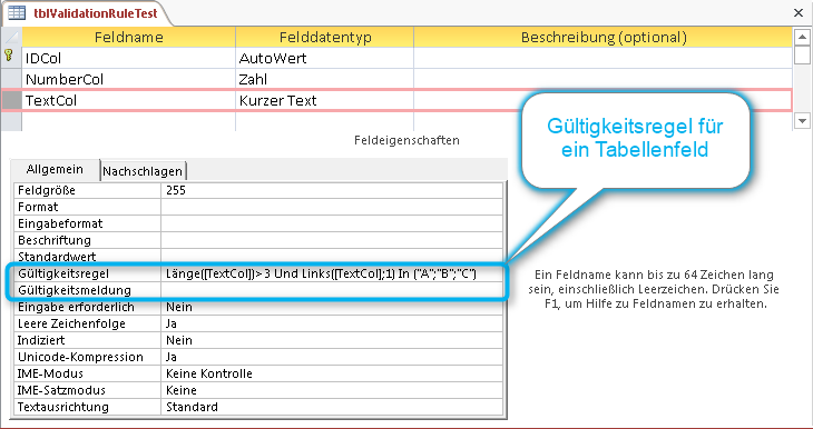 Based on a photo by Glenn Carstens-Peters, used here under CC0 licensing Sie werden oft übersehen, dennoch sind sie ein wichtiger Teil des Datenbankentwurfs. - Gültigkeitsregeln in Access Tabellen. – Auch bekannt als CHECK CONSTRAINTs im SQL Standard und in den meisten anderen Datenbanksystemen. Warum überhaupt Gültigkeitsregeln in Tabellen verwenden?In Access Formularen kannst du eine Vielzahl von Benutzerdefinierten Datenvalidierungsregeln für die vom Benutzer in dem jeweiligen Formular eingegebenen Daten implementieren. Wenn du Before-Update (oder -Insert, -Delete) Ereignisprozeduren der einzelnen Steuerelemente oder des Formulars selbst verwendest, sind den Möglichkeiten der Eingabevalidierung praktisch keine Grenzen gesetzt. Verglichen mit der Eingabevalidierung in einem Access Formular, haben Gültigkeitsregeln in Tabellen einen sehr eingeschränkten Umfang an möglichen Operationen. Nur eine beschränkte Untermenge der eingebauten (VBA) Funktionen ist verfügbar. Diese schließen die Domänenaggregatfunktionen,wie DomAnzahl oder DomSumme, nicht ein, die ich dabei am schmerzlichsten vermisse. Und natürlich kannst du auch keine eigenen, benutzerdefinierten VBA Funktionen in einer Gültigkeitsregel verwenden. - Dies beschränkt letztendlich jede Gültigkeitsregel darauf mit dem aktuellen Datensatz, der gerade validiert wird, zu arbeiten. Andererseits haben aber direkt in den Tabellenentwurf integrierte Gültigkeitsregeln einen sehr bedeutenden Vorteil. Sie werden immer angewendet. Egal ob die Daten in einem bestimmen Formular eingegeben werden, durch Anfüge- oder Aktualisierungsabfragen geschrieben werden oder aus einer externen Datei importiert werden. Immer wenn Daten in einer Tabelle geändert werden, werden auch die dafür definierten Gültigkeitsregeln überprüft. Arten von GültigkeitsregelnEs gibt zwei sehr ähnliche Arten von Gültigkeitsregeln, die du im Tabellenentwurf verwenden kannst. (Eigentlich gibt es drei Arten, aber dazu kommen wir später.) Die am häufigsten verwendeten Gültigkeitsregeln sind wahrscheinlich die Feld-bezogenen Gültigkeitsregeln. In diesen Gültigkeitsregeln kannst du dich nur auf das jeweilige Feld beziehen, für das die Gültigkeitsregel gilt. Um eine Gültigkeitsregel zu erstellen, kannst du entweder per Hand in die entsprechende Textbox der Feldeigenschaften schreiben, oder du klickst auf den […]-Button um den Ausdrucks-Generator zu starten. Ich persönlich ziehe es vor Ausdrücke per Hand zu schreiben, aber Ausdrucks-Generator hat den Vorteil, dass er nur die Funktionen zur Auswahl anbietet, die du auch wirklich im Ausdruck einer Gültigkeitsregel verwenden kannst. Ich finde es sehr nützlich, dass man in diesen Ausdrücken auch die SQL-Vergleichsoperatoren LIKE, IN und BETWEEN verwenden kann. Hier ist ein Beispiel für einen Ausdruck einer Gültigkeitsregel für das Feld TextCol.