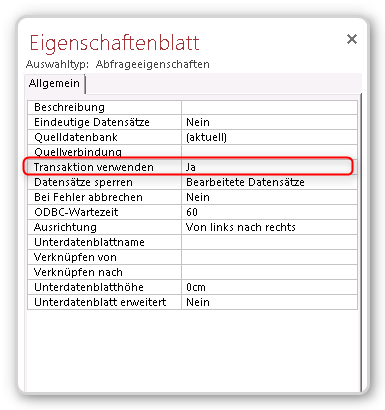 Was sind Transaktionen?Transaktionen sind ein fundamentales Konzept relationaler Datenbanken. Transaktionen fassen mehrere Operationen in einer Datenbank zu einer Arbeitseinheit zusammen. Diese Arbeitseinheit kann entweder als Ganzes erfolgreich sein oder als Ganzes fehlschlagen. Wenn sie erfolgreich ist werden alle Änderungen, die im Rahmen der Transaktion durchgeführt wurden, endgültig gespeichert (commit) und damit dauerhaft in die Datenbank geschrieben. Wenn nur ein Teil der Transaktion fehlschlägt, werden die Änderungen zurückgerollt (rollback) und alle Daten, die innerhalb der Transaktion geändert wurden, sind immer noch in genau dem Zustand in dem sie vor der Transaktion waren. Ein klassisches Beispiel für eine Transaktion ist der Transfer von Geld von einem Bankkonto zu einem anderen. Es darf absolut niemals passieren, dass Geld von einem Konto abgebucht wird ohne dass es dem Gegenkonto gutgeschrieben wird. Um dieses Verhalten sicherzustellen, müssen die Änderungen an den beiden Konten in einer Transaktion zusammengefasst werden. Unmengen wurden bereits über Transaktionen und das ACID-Paradigma geschrieben, daher werde ich hier nicht tiefer in die generelle Datenbanktheorie eintauchen. Transaktionen in AccessAccess, oder genauer die Jet-/ACE-Datenbank-Engine, unterstützt ebenfalls Transaktionen. Sie werden sogar standardmäßig für jede Aktionsfrage genutzt. Allerdings wird dann nur eine einzelne Abfrage innerhalb einer Transaktion ausgeführt, so dass Du es kaum bemerkst, dass eine Transaktion involviert ist. Dennoch stellt die Transaktion sicher, dass alle Änderungen, die innerhalb der Transaktion vorgenommen wurden, im Falle eines Fehlers komplett rückgängig gemacht werden können. (Du kannst die Verwendung von Transaktionen für eine bestimmte Abfrage deaktivieren, indem du die „Transaktion verwenden“-Eigenschaft auf „Nein“ setzt.)